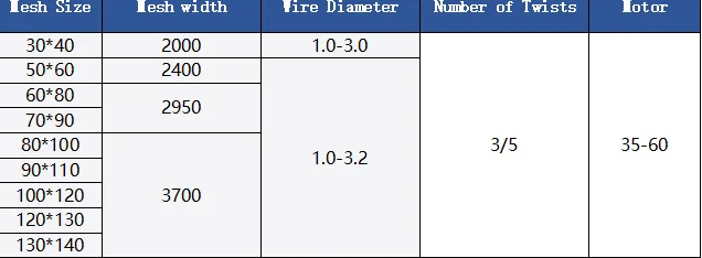 Specificatietabel: Typische kenmerken van de visnetmachine